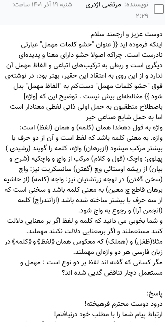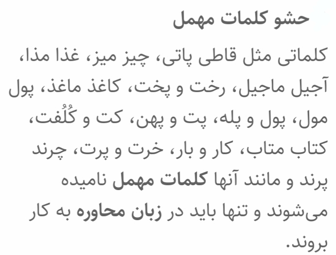 و شما بهخوبی میدانید که کلمه و لفظ اگر بر معنایی دلالت کنند، مستعملند و اگر بر معنایی دلالت نکنند، مهملند. مثلا؛ (ظفل) و (هملک) که معکوس همان《لفظ》و《کلمه》در زبان فارسی است، هر دو واژهای مهملند.