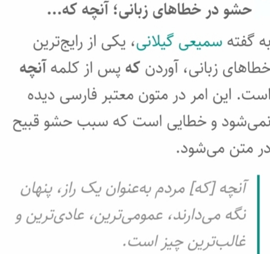 《یکی از رایجترین خطاهای زبانی، آوردن "که" پس از کلمهی "آنچه" است. این امر در متون معتبر فارسی دیده نمیشود(!) و خطایی است که سبب حشو قبیح در متن میشود(!) مانند؛ آنچه "که" مردم بهعنوان یک راز، پنهان نگه میدارند، عمومیترین، عادیترین و غالبترین چیز است》