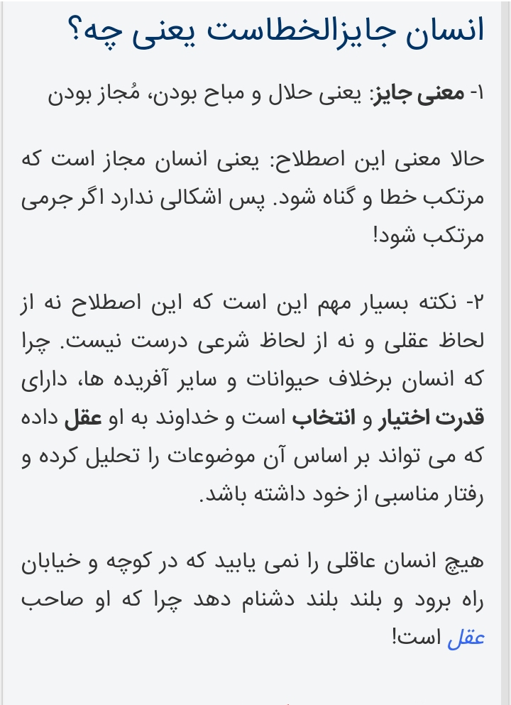 دیگر اینکه، فرمودهاند؛ (انسان جایزالخطاست) یک اصطلاح است اما از بیتعمقی و ناآگاهی به ترجمهی لفظبهلفظ پرداختهاند! مگر نمیدانند؛ (اصطلاح عبارتی است که معنایی غیر از معنای اصلی را افاده میکند؟)