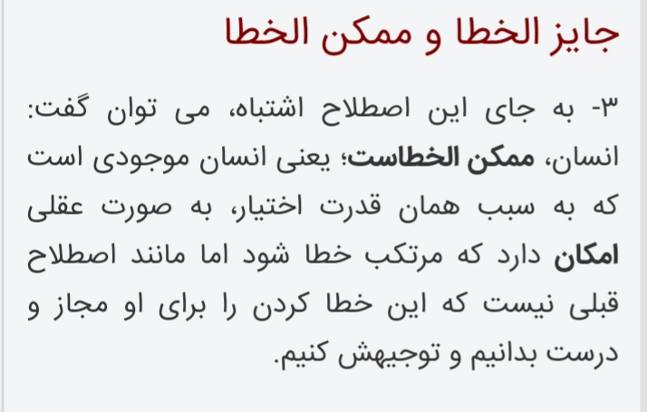 بنابراین، ترکیب جایزالخطا را آنگونه که گروهی کمتعمقِ بهدور از مطالعه تصور کردهاند؛ بهمعنای جملهی (انسان سزاوار این است که خطا کند) نیست، بلکه بهمعنای آن است که آفرینش آدمی بهگونهای صورت پذیرفته که از او گمان خطا میرود یا این قابلیت را دارد که اشتباه کند و بالفعل آن میشود، "ممکنالخطا"