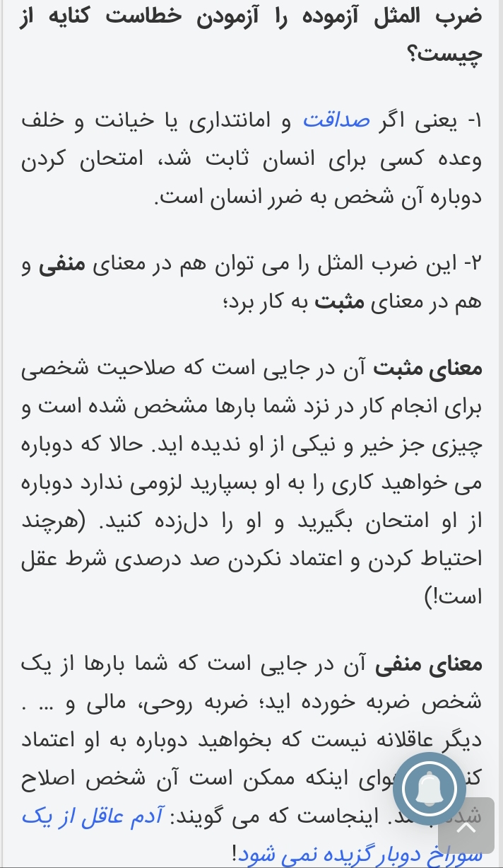 همانطور که در اولین تصویر فوق مشاهده میفرمایید؛ از عبارت؛ (آزموده را آزمودن خطاست) بهعنوان ضربالمثل یاد کردهاند و این در حالی است که در تصویر دوم مرحوم دهخدا شبیه آن را "تمثل" نامیده است. در عبارت فوق هیچ مثلی مشاهده نمیشود که بتوان نام آنرا ضربالمثل نامید بلکه گفتاری است، مشهور که بهمنظور نمونه آورده شده است! ضمنا مثبت و منفی هم ندارد که نویسندهی بیتعمق ناشی گمان کرده که این تمثل تنها برای آزمایش کردن افراد بهکار میرود.