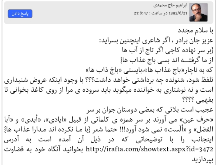 ((گمان میکنم برای چون شمایی بسیار زود است که میزان اطلاعاتتان از علم عروض حتی در حد شاگردان ایشان [ابراهیم حاج محمدی] باشد تا چه رسد در حد خود ایشان))