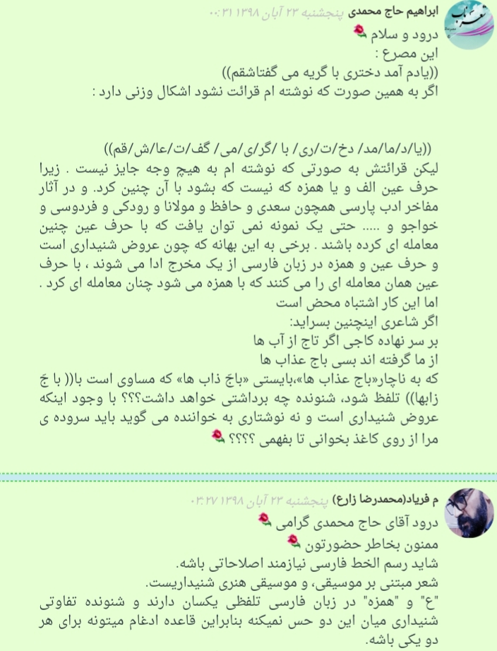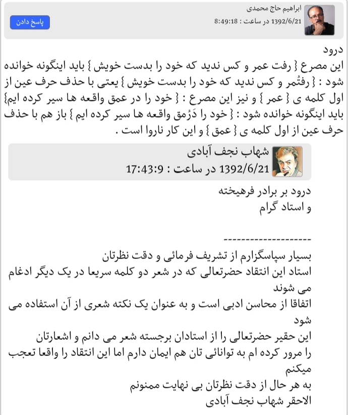 ((شما چرا در برابر سخن حق فروتنی و تواضع ندارید و خودتان را میپیچانید. چه در عروض سنتی و چه در عروض جدید به تصریح بزرگانی چون؛ علامه شفیعی کدکنی وصل حرف عین «که در حقیقت به حذف آن میانجامد» اشتباه محض است. مواردی را هم که استاد شفیعی کدکنی از عارف قزوینی به عنوان شاهدمثال آورده، به تصریح حضرت ایشان از نقاط ضعف و ایرادات اساسی کار عارف قزوینی است!))