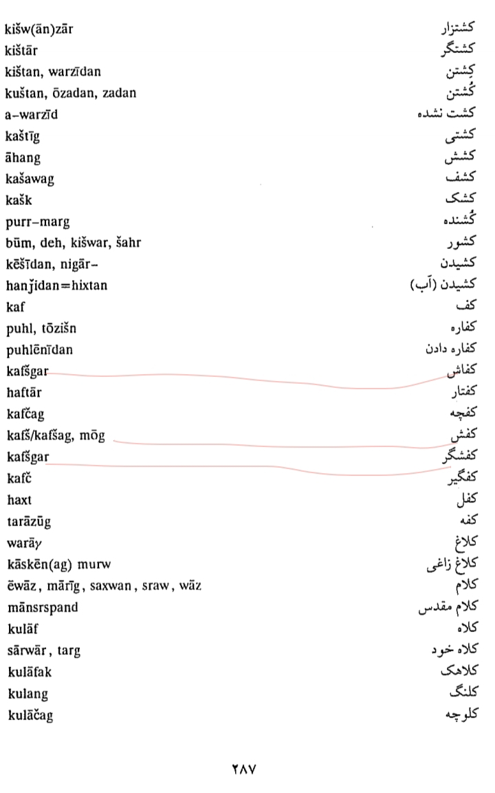 مردم از "کفش" که به زبان کهن پهلوی است، صفت شغلی "کفّاش" بر وزن فعّال را آفریدهاند که اصولا نیازی بدان نبوده است، چراکه در زبان پهلوی بدان "کفشگر" میگفتهاند!