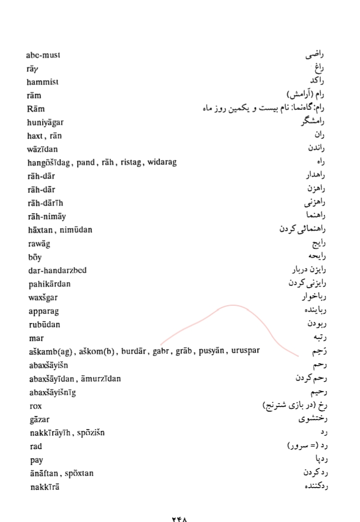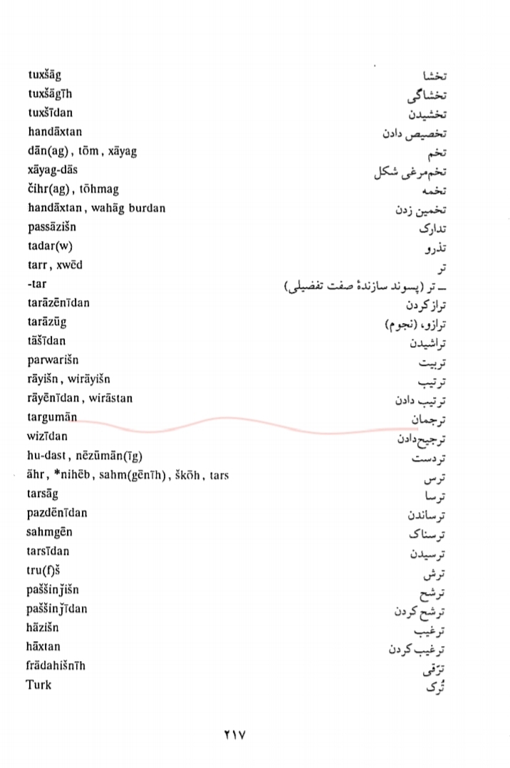 (دین: دین) (مسجد: مزگت) (محراب: مهراو) (رضوان: رَزوان) (جُناح: گناه) (قاضی: کادی) (خانقاه: خانگاه) (فردوس: پردیس. بهشت) (دیوان: دیوان) (وزیر: وجیر) (مارستان: بیمارستان) (میدان: میدان) (کارنامج: کارنامه) (استاذ: استاد) (زمان: زمان) (سراج: چراغ) و ...